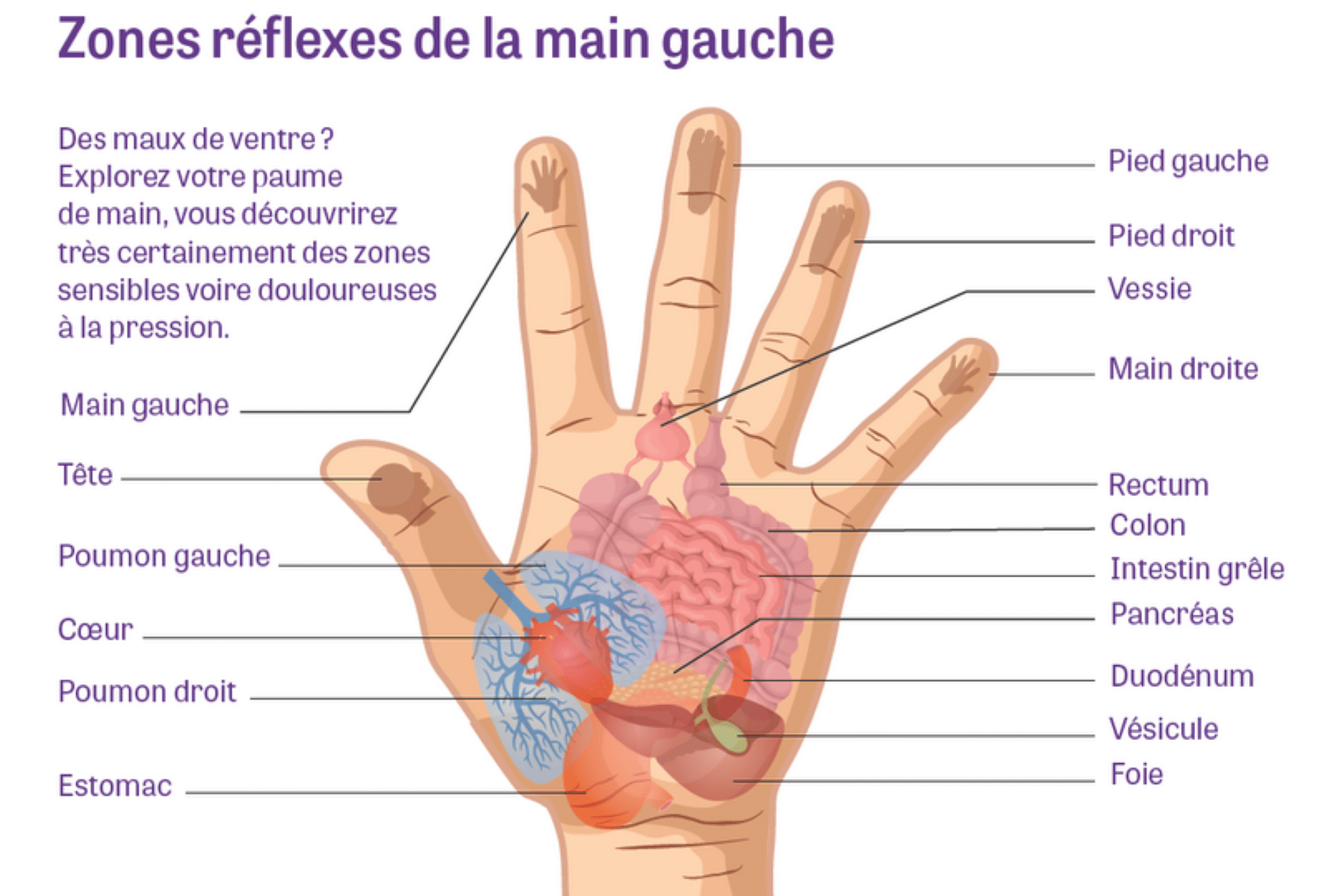 Je vous apprendrai à repérer sur vos mains les zones réflexes à stimuler afin de faire taire la douleur.