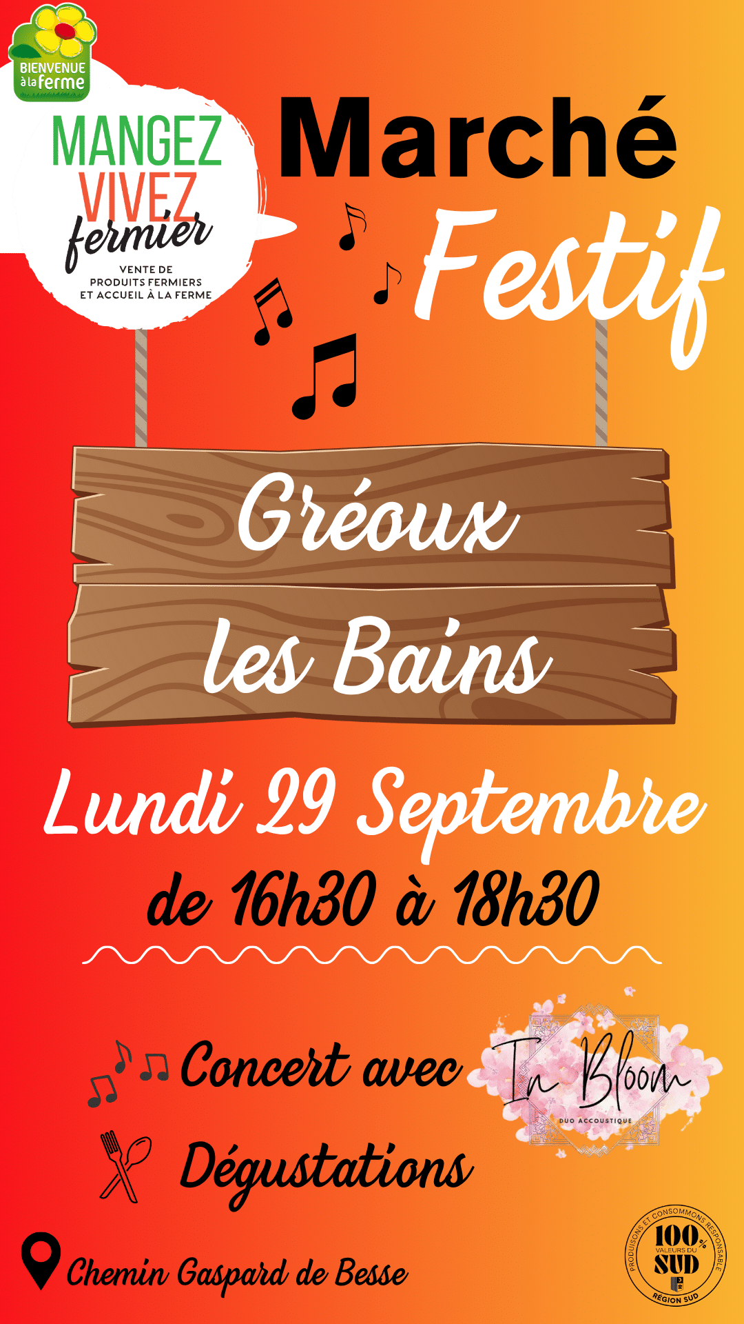Chemin Gaspard de Besse, D8 (04800) Chemin Gaspard de Besse, D8, Gréoux-les-Bains, FranceVotre marché de producteurs du Lundi devient festif : concert avec dégustations ou démonstrations et dégustations culinaires.
