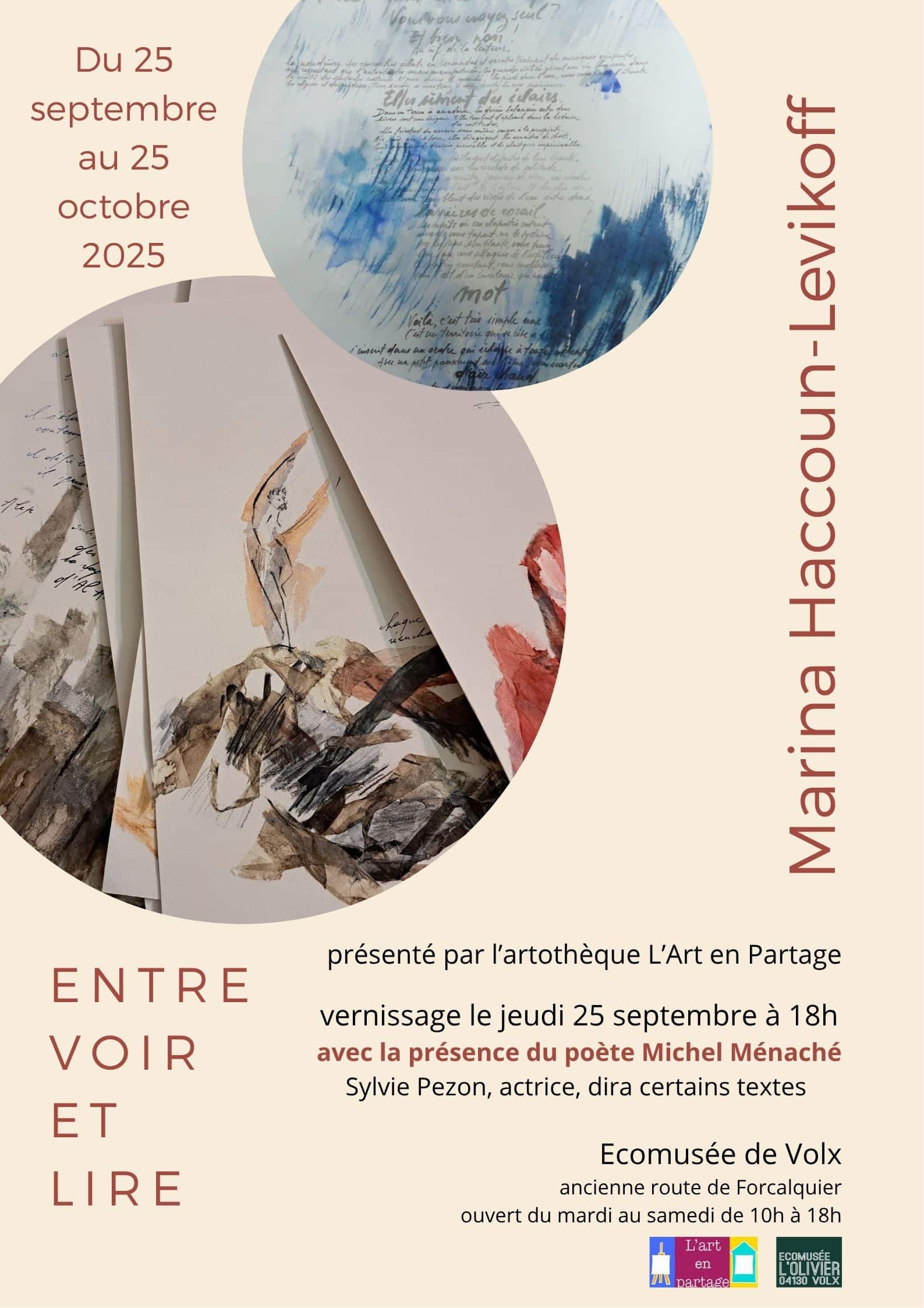 Vitrine qui annonce l'exposition "Entre voir et lire" à l'Ecomusée de l'Olivier de Volx qui débute le 25 septembre dans le cadre du OFF des Correspondances de Manosque. -
