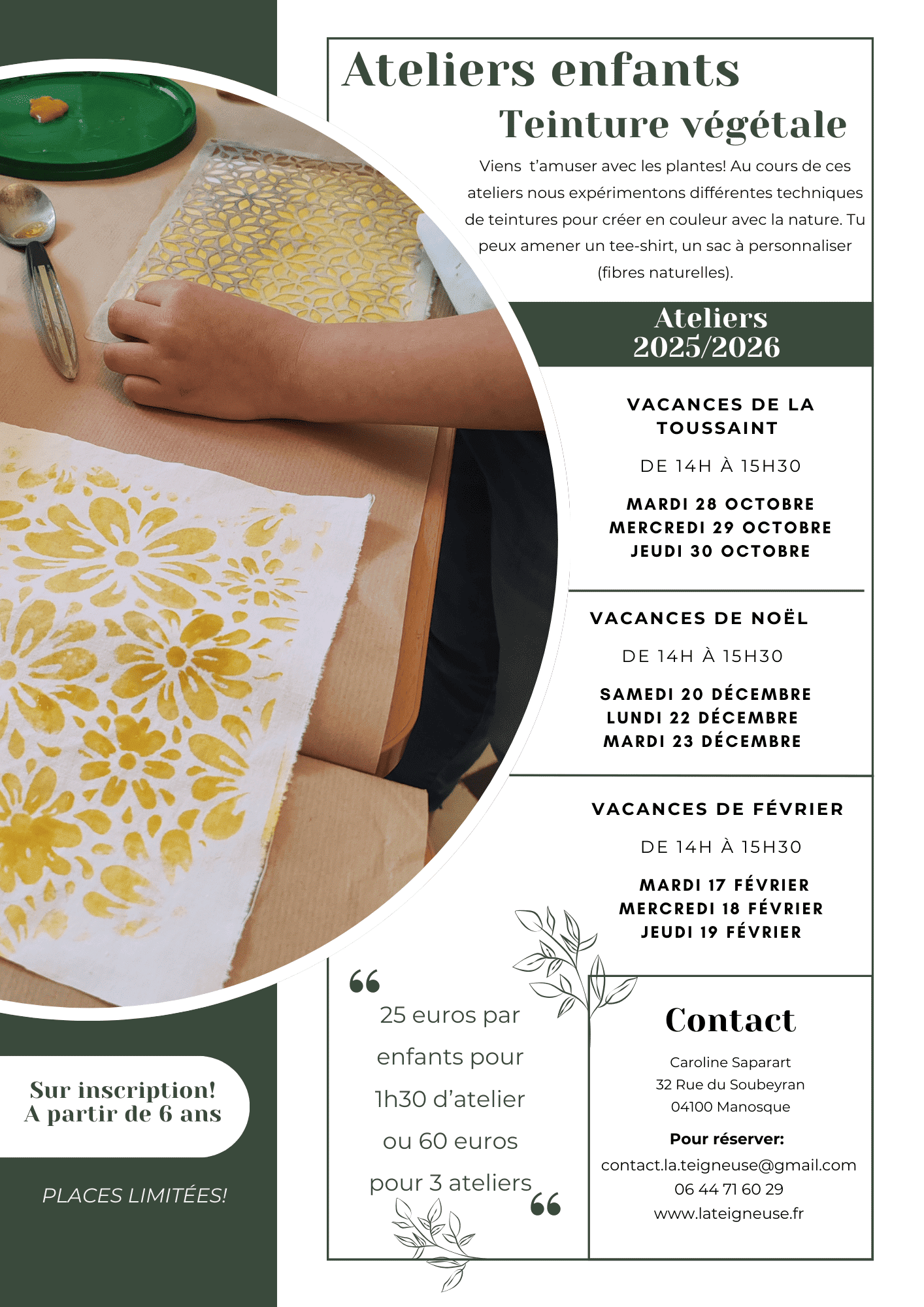 Atelier la teigneuse 32 rue du Soubeyran, Manosque, FranceAteliers de teinture végétale ludique et adaptés aux enfants.